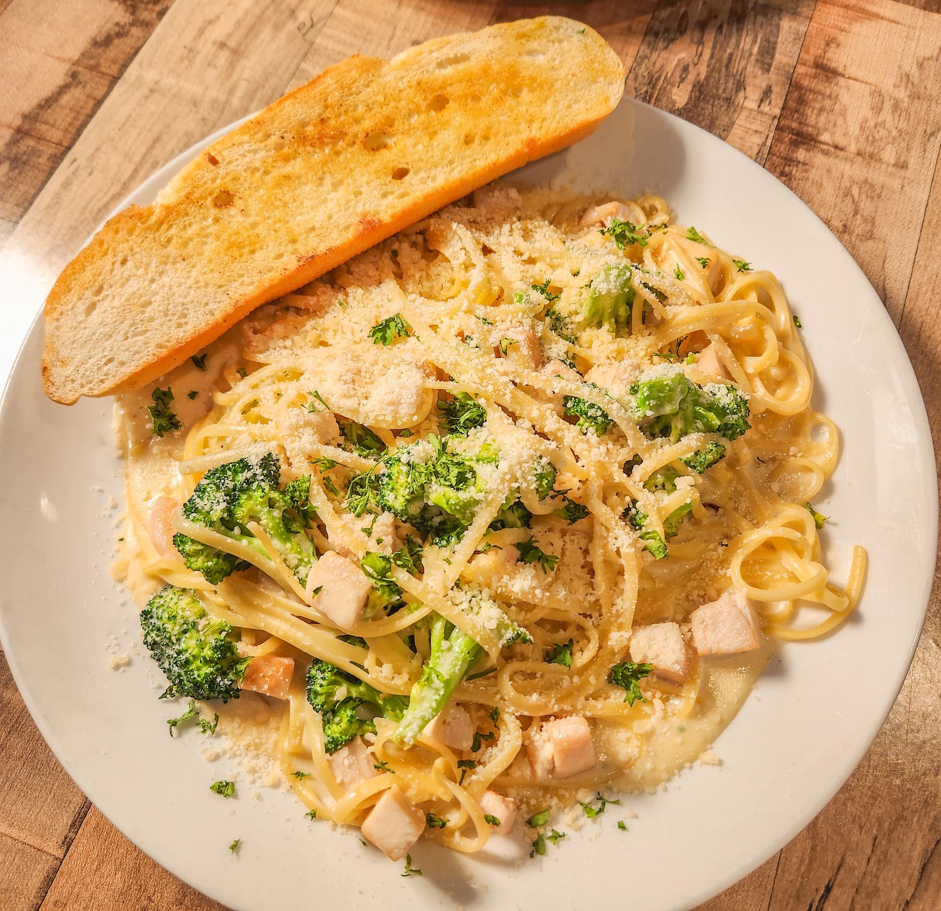 Creamy alfredo sauce served over linguine pasta, with chicken and broccoli. Served with a sprinkle of parmesan cheese and a Milano garlic roll.