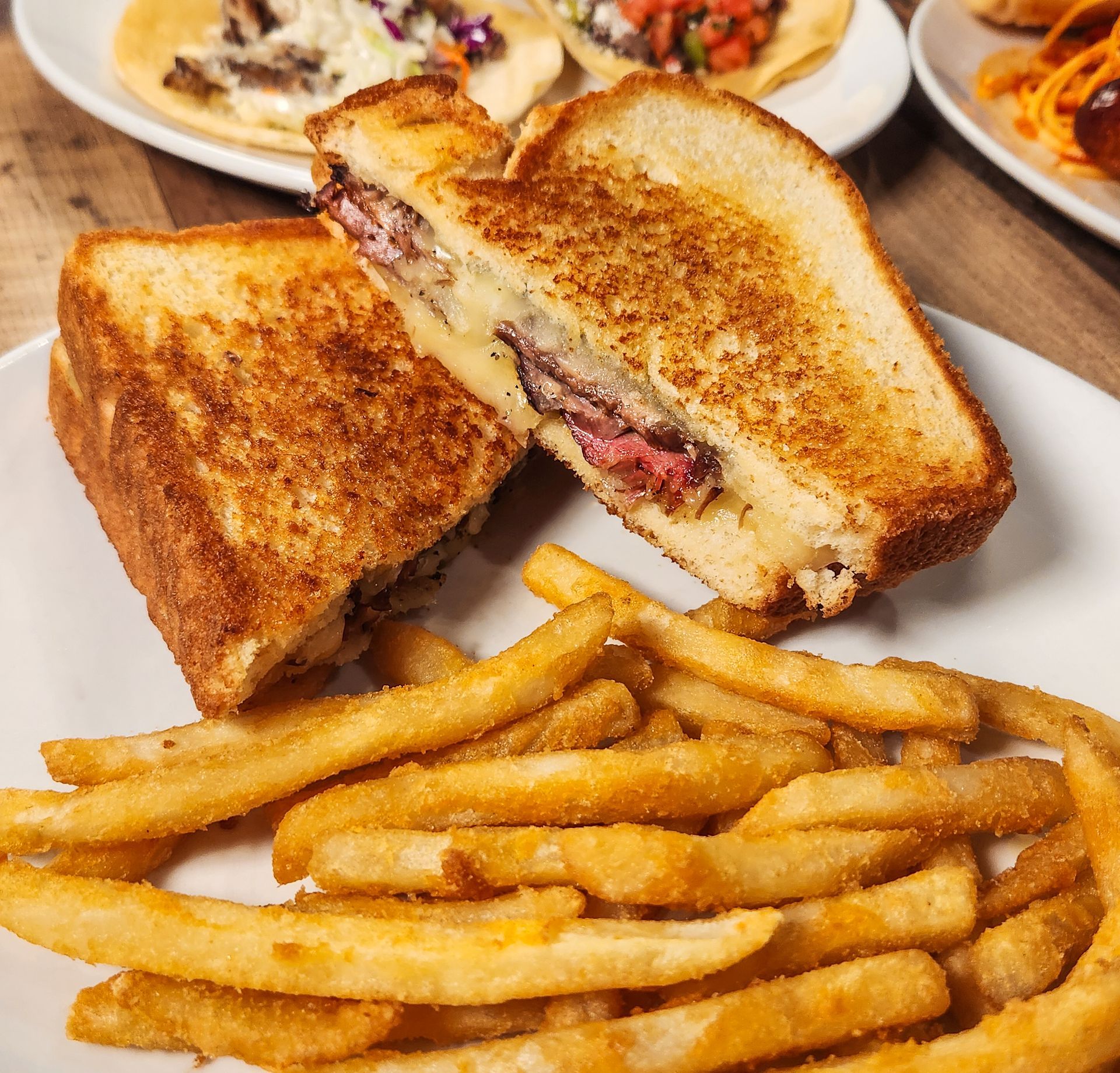 A blend of Monterey jack and white cheddar cheeses, melted on our thick white bread. Add green chilies $1 or smoked brisket $5