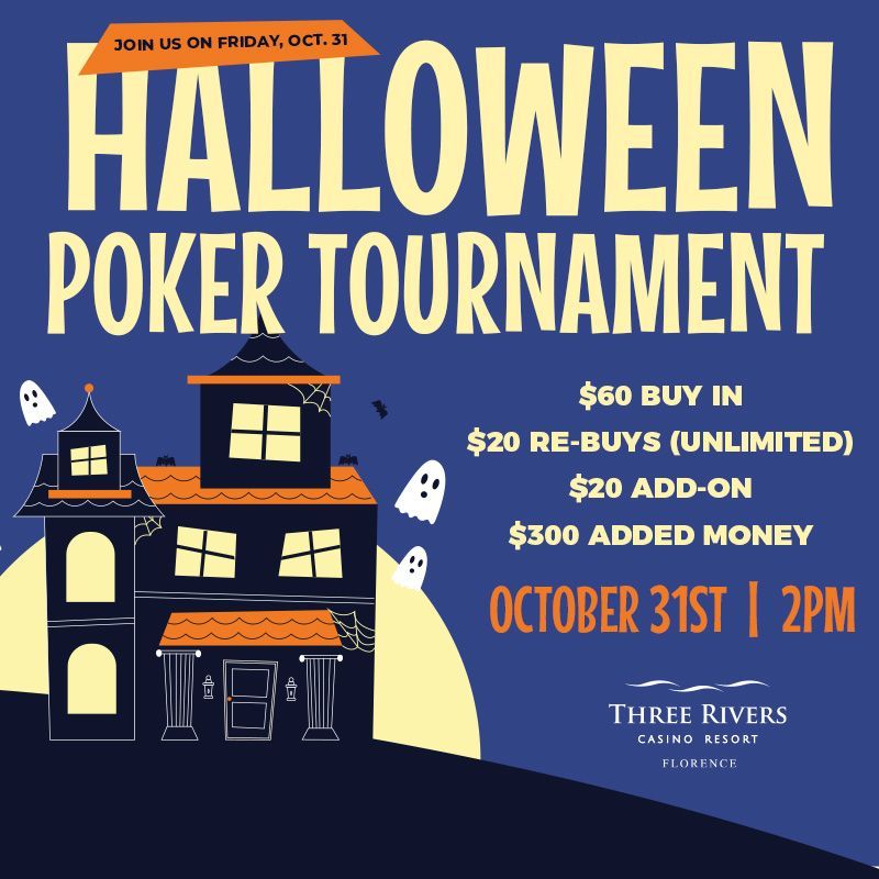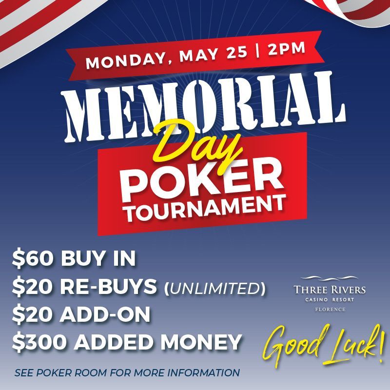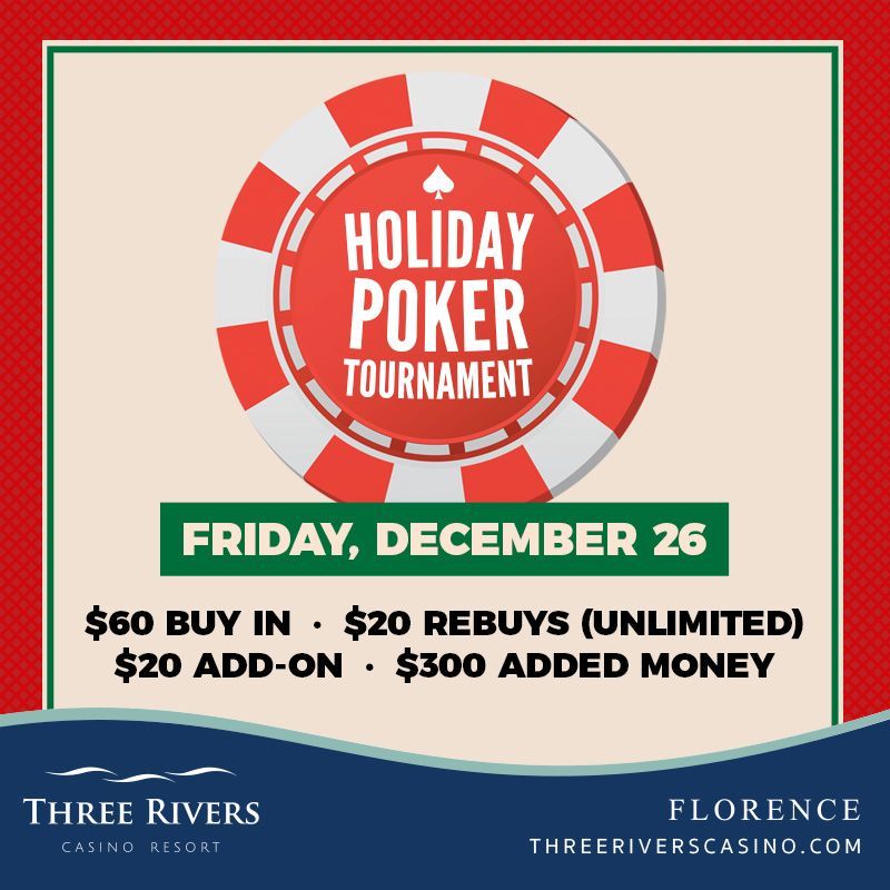 $50 buy-in, $10 entry fee. Unlimited $15 re-buys until end of the 5th level. Must be felted to re-buy. $6,000 in starting chips. Re-buy will get you $3,000. $15 add- on at the end of the 5th level. Add-on will get you $3,000.